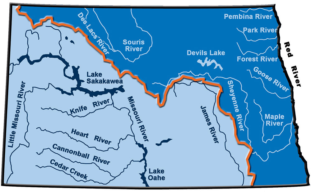 A major geographic feature of North Dakota is the Continental Divide. (See Map 2.) A continental divide is a rise of ground that separates the flow of rivers. North America has several divides. The highest and best known of these is the Great Divide along the crest of the Rocky Mountains. The Great Divide sends water flowing west to the Pacific Ocean, or east to the Mississippi River. The Continental Divide of North Dakota runs from the northwestern corner to the south-central border of the state. The divide makes rivers and creeks flow south or north. Though the headwaters of the James and Sheyenne Rivers rise only a few miles apart, the Continental Divide sends the James south to the Missouri River (in South Dakota) and the Sheyenne north where it joins the Red River on its way to Hudson Bay.
