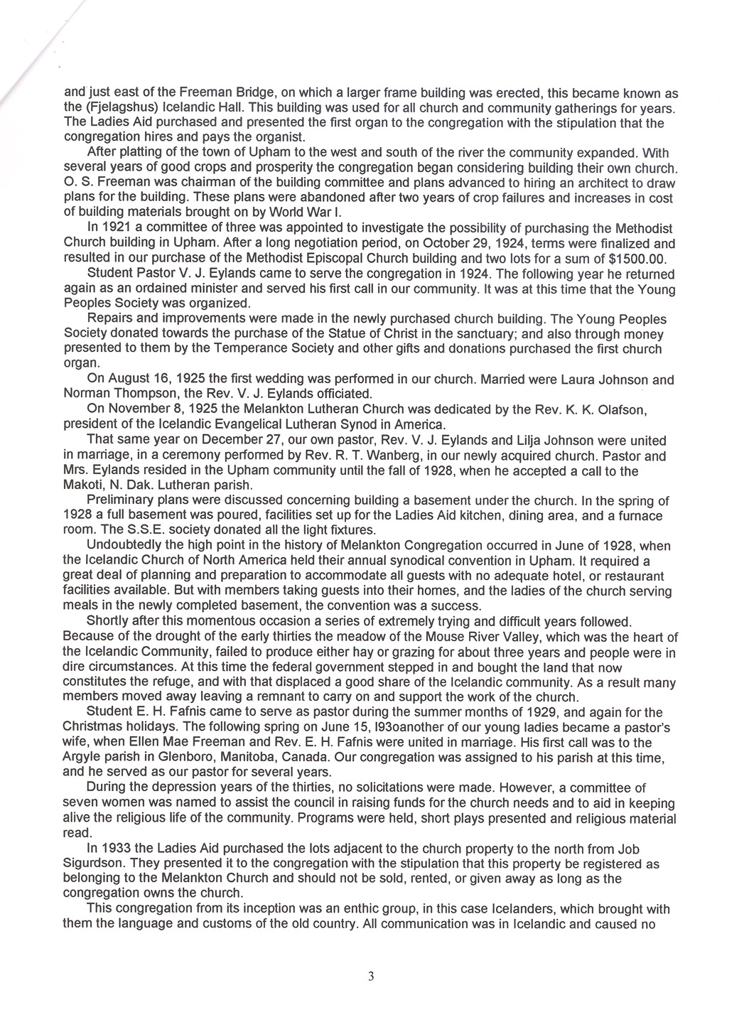 Many churches celebrated important anniversary dates. The Melankton Icelandic Lutheran Church celebrated an anniversary with a special worship service. The program for that service included a history of the church. (See Document 1)