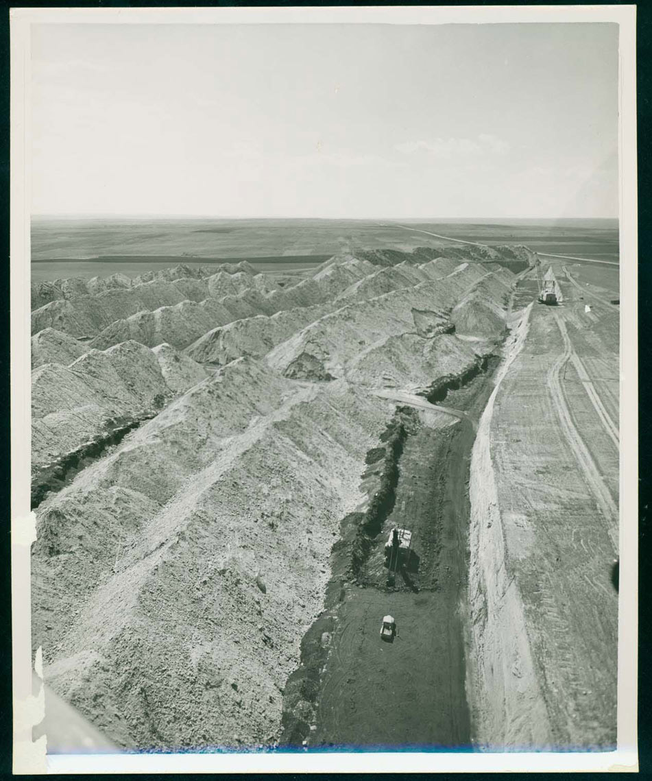 In 1967, the North Dakota legislature decided to study the problem. As a result, the 1969 legislature passed a surface mining reclamation bill that “encouraged” mine operators to restore the land after the mine operation was finished. (See Image 12.) This law was amended in 1975 to outline specific requirements for reclamation. The law requires mine operators to put the land back as they found it. This means that before receiving a permit to operate a surface mine, the mine operator has to carefully survey the topography and soil of the area and save five feet of topsoil and subsoil as it is removed from the coal vein. When the mining has finished extracting the coal, the operator has to re-place the soil, make the land have the same contours as it had before the mine was opened, and plant grasses, trees, shrubs or whatever was appropriate to the landscape. The operator has three years to complete the reclamation and has to pay for the work. In addition, the mine operator has to be sure that the surface land owners’ water supply was not damaged in any way.