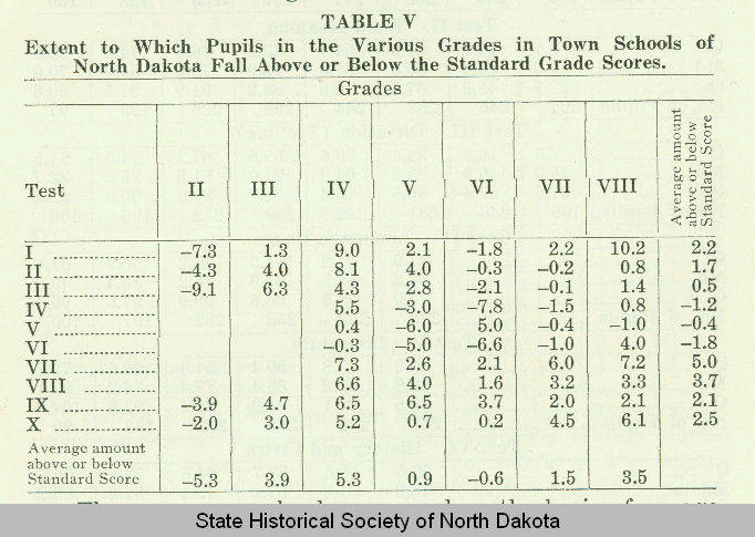 Table V shows the scores achieved on each test (left hand column) by all the students in each grade (II through VIII) who sat for the test in North Dakota’s towns. The averages are close to the national standards, but a few fall below. The tests topics are numbered as follows: